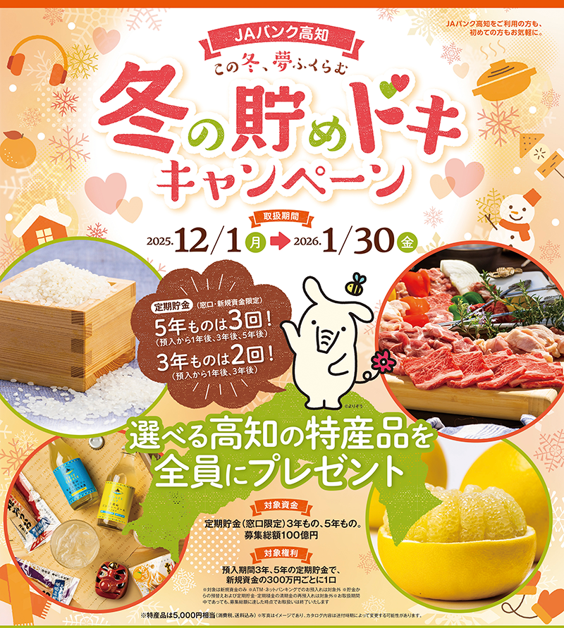 JAバンク高知では、令和7年12月1日~令和8年1月30日まで「JAバンク高知 冬の貯めドキキャンペーン」を実施いたします。